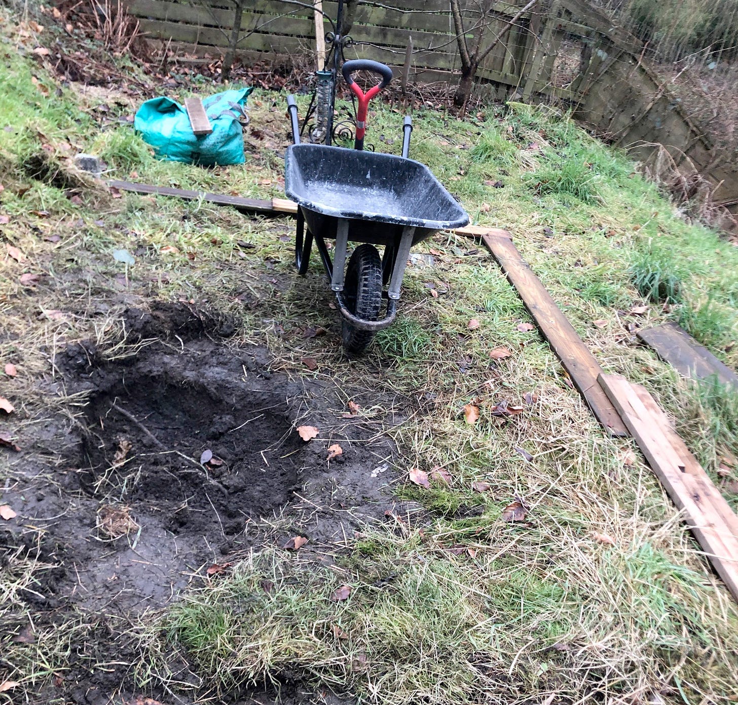 I removed some of the turf and dug a test pit. Oh what absolute delight I felt when I realised I would be able to do it. Although we have very heavy clay we have no stones. My detectorist’s serrated spade sliced easily through the clay, and with few roots other than the grass roots, I did a tiny dance of joy.