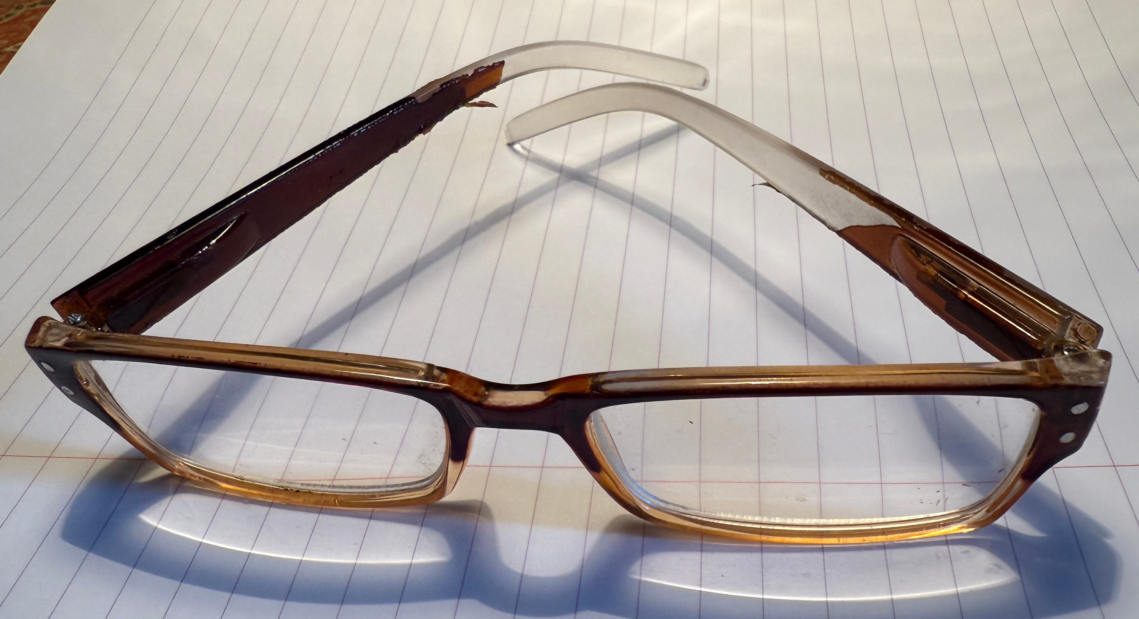 This brown pair has done sterling work for several years. They were extremely cheap painted plastic, and are slightly too large for my face, but they’ve never let me down. Much of the paint is peeling off and sometimes flakes end up in my eye, and now the frame has cracked. They have come to the end of their helpful life. Thank you spectacles.